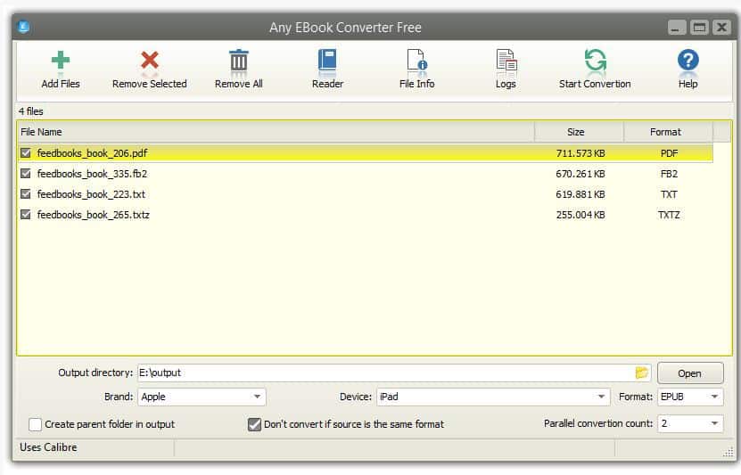 Любая программа EBook Converter Free является определением лучшего программного обеспечения для конвертации электронных книг. Эта программа представляет собой многопоточный конвертер, который может конвертировать до 16 электронных книг одновременно. Эта программа имеет огромный список поддерживаемых форматов ввода и вывода электронных книг: FB2, CBZ, CHM, LIT, ODT, EPUB, MOBI, DOCX, SNB, AZW3 PDF, TXT, HTML, PML, RTF и другие форматы электронных книг. Вы можете свободно конвертировать между каждым из них.