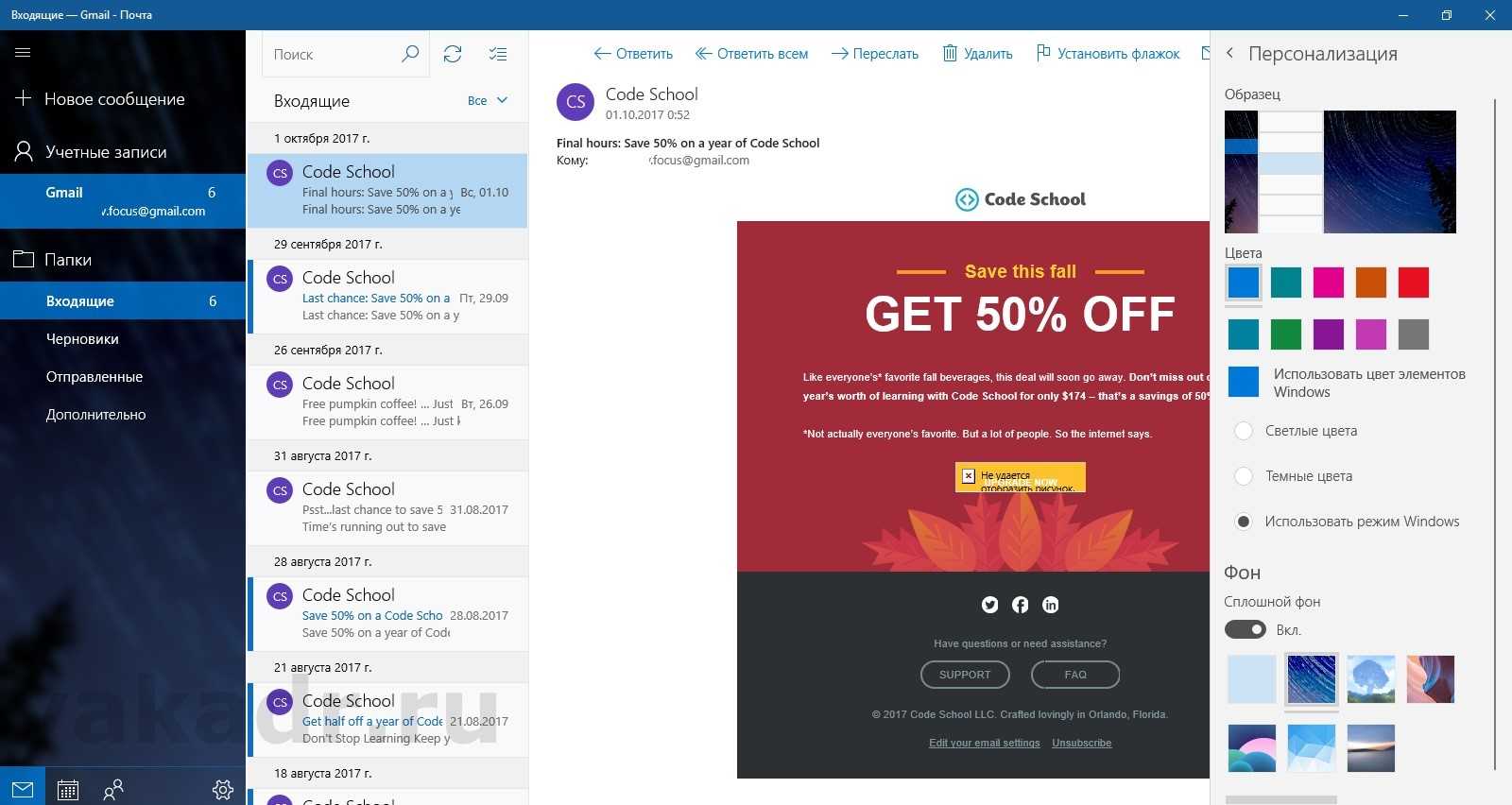 Следующий раздел «Параметров» называется «Персонализация». Тут мы можем настроить внешний вид самой почтовой программы, задав ее цвет или фоновое изображение.