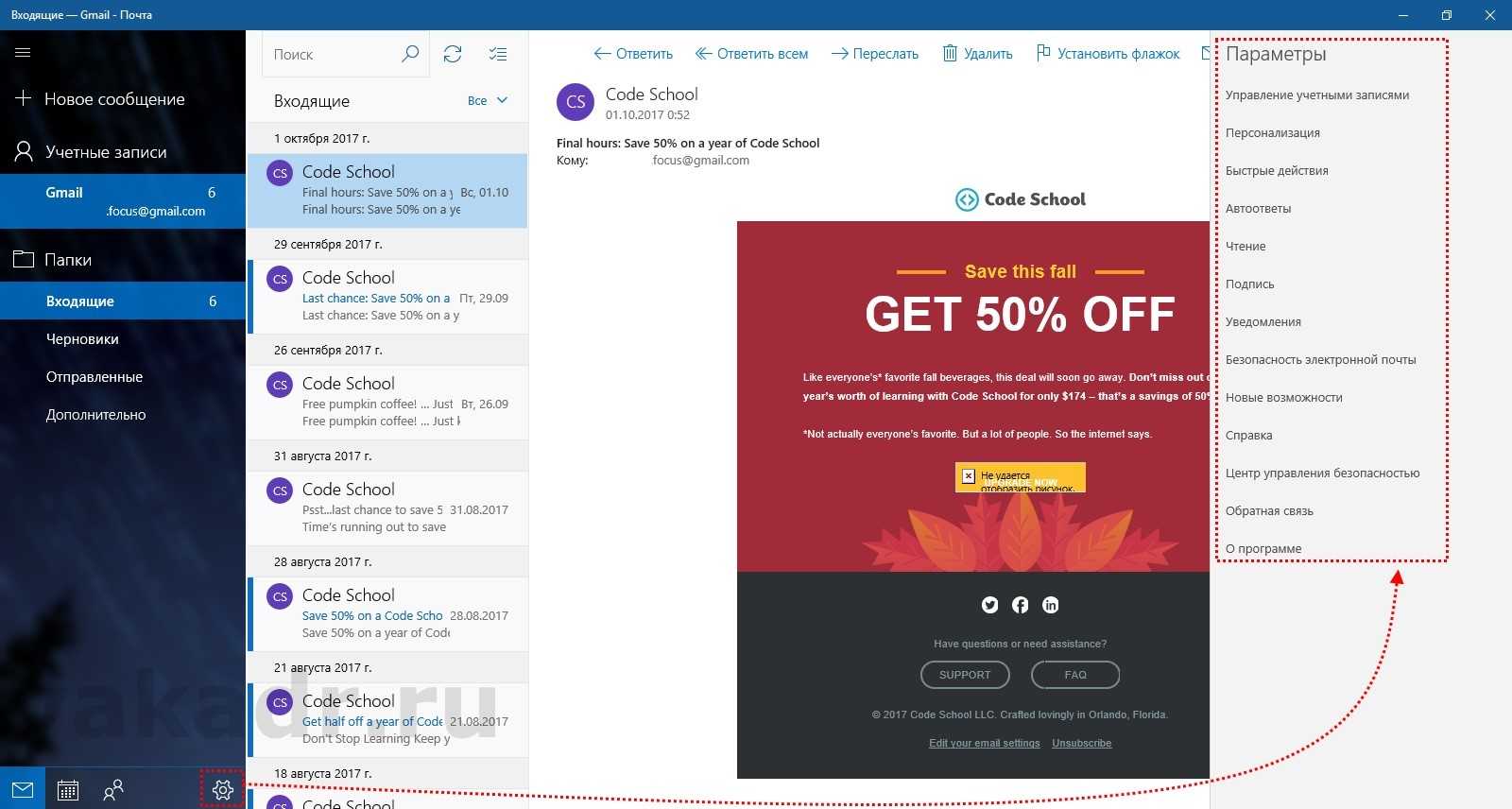 В этой заметке мы детально разберемся с немногочисленными настройками Почты.