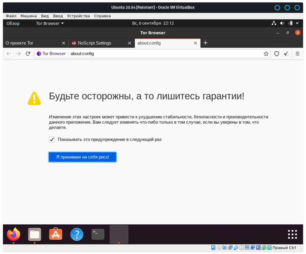 Далее в адресной строке набираем “about:config”, после чего соглашаемся с предупреждением нажав на кнопку “Я принимаю риск на себя”: