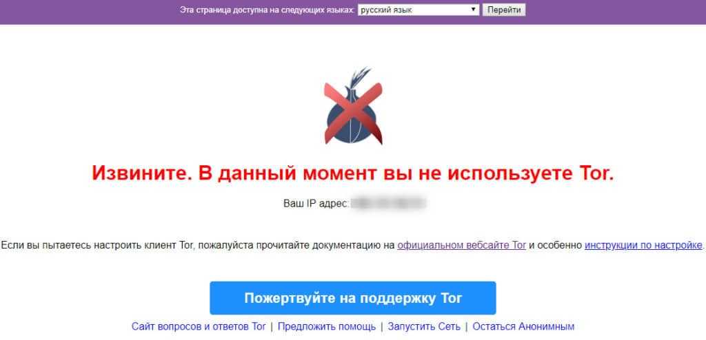 Если вы не используете сеть Tor, вы увидите следующую страницу: