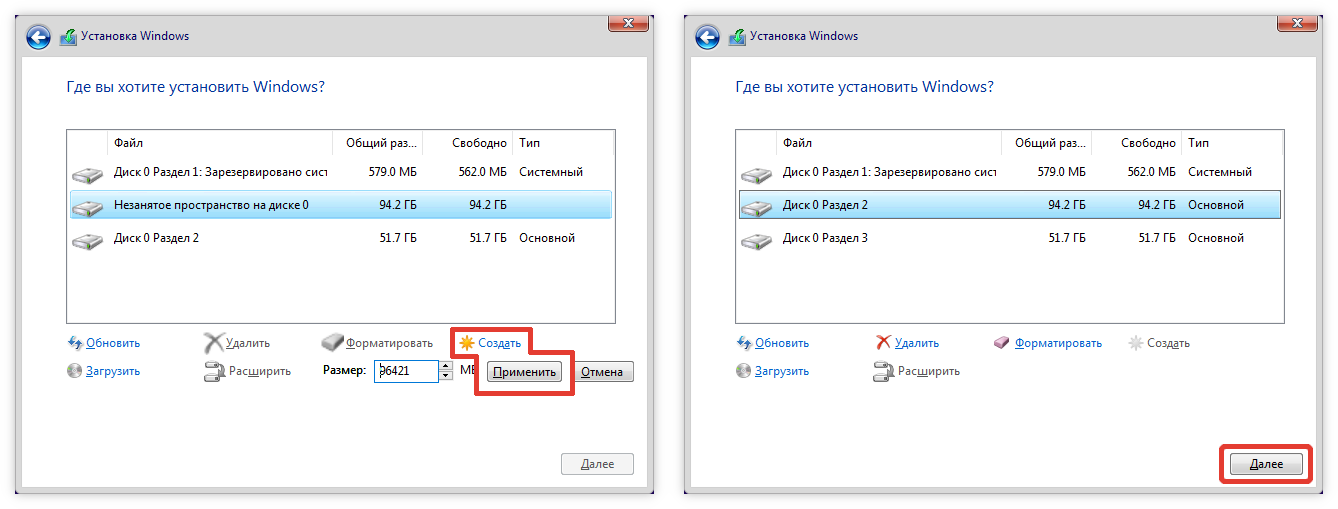 - Выделить пустой раздел. Если пункт обозначен как Незанятое пространство на диске, кликнуть Создать, Применить.