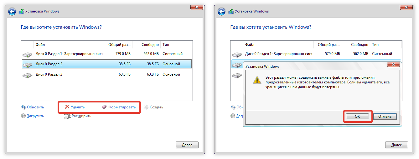 Для выполнения операции потребуется при запуске компьютера нажать на кнопку, которая вызывает Меню загрузки. В окне Установка Windows нужно сделать следующее: