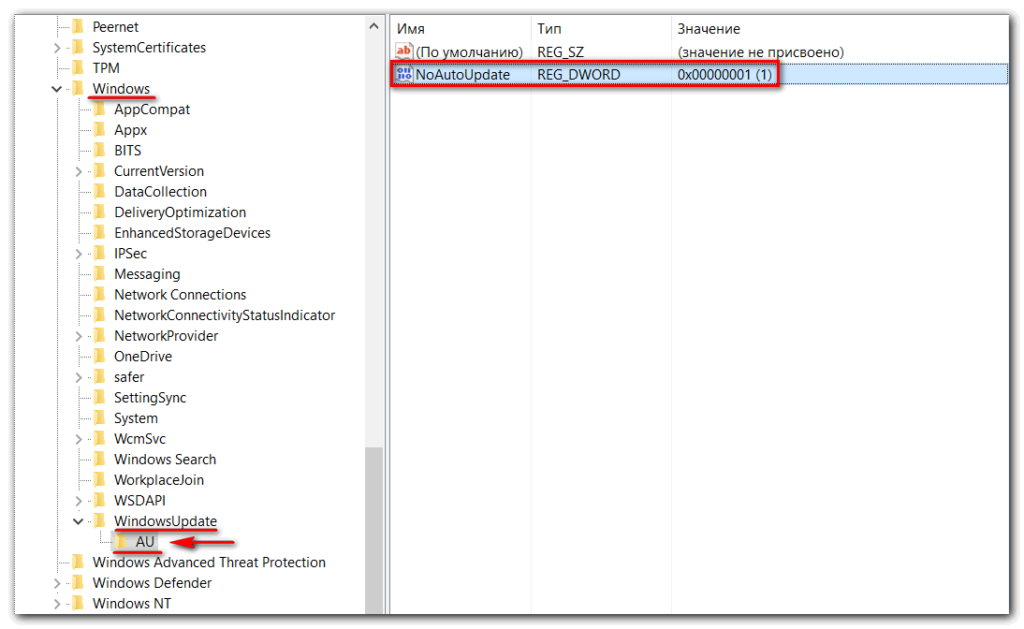 - Куда мы добавим подраздел AU. В последнем мы подготовим параметр DWORD, назвав его NoAutoUpdate. В качестве значения используем единичку (1).