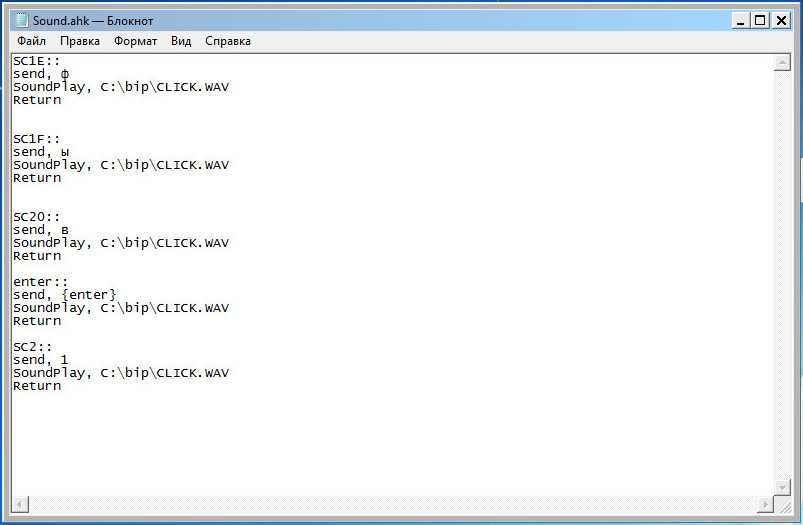 Команда send во второй строке кода отправляет действие, а именно выводит букву ф. За ней следует команда SoundPlay, в качестве ее аргумента указывается путь к аудиофайлу в формате WAV, так как файлы именно этого формата могут воспроизводиться Windows в фоне. Завершается блок кода командой Return, возвращающей скрипт в начало, в состояние ожидания следующего нажатия клавиши. Если Return не указать, звук «залипнет». Сохраните файл в формате AHK и запустите.
