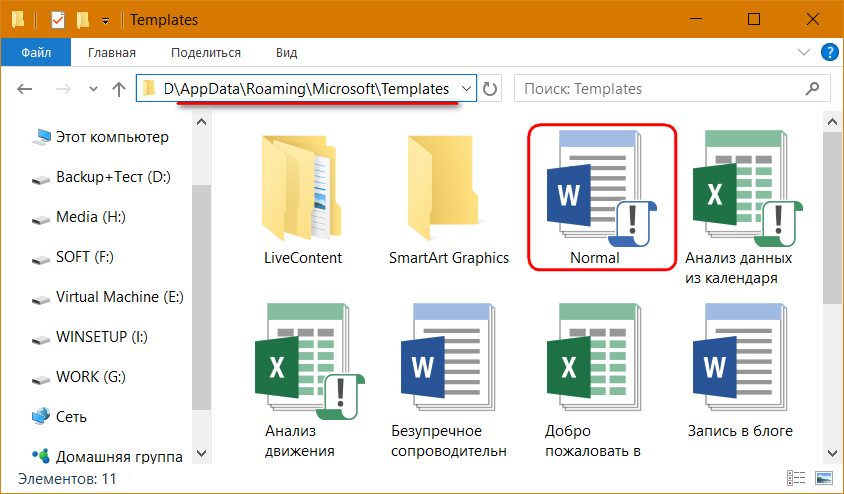 Настроенный шаблон по умолчанию (открывающийся как любой новый документ) со своей темой оформления, коллекцией стилей форматирования, макетом, колонтитулами, подложкой и прочими индивидуальными вещами также можно перенести в другую среду Windows. В папке «Microsoft» открываем подпапку «Templates» (в Word 2010 эта папка имеет русскоязычное название «Шаблоны») и делаем резервную копию хранящегося там файла Normal.dotm .