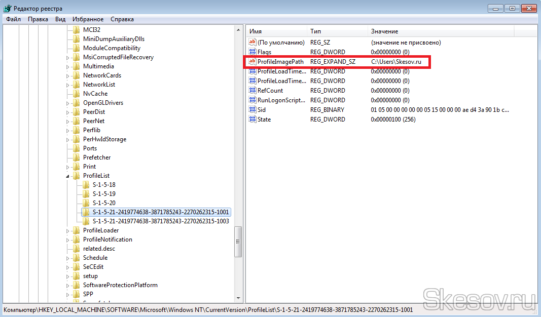 Нас интересуют группы формата S-1-5-21-xxxxxxxxxx-xxx… выбираем их по очереди и смотрим на значение параметра ProfileImagePath . Путь должен вести в папку к профилю, который нам нужно перенести. В моём случае это вот этот: