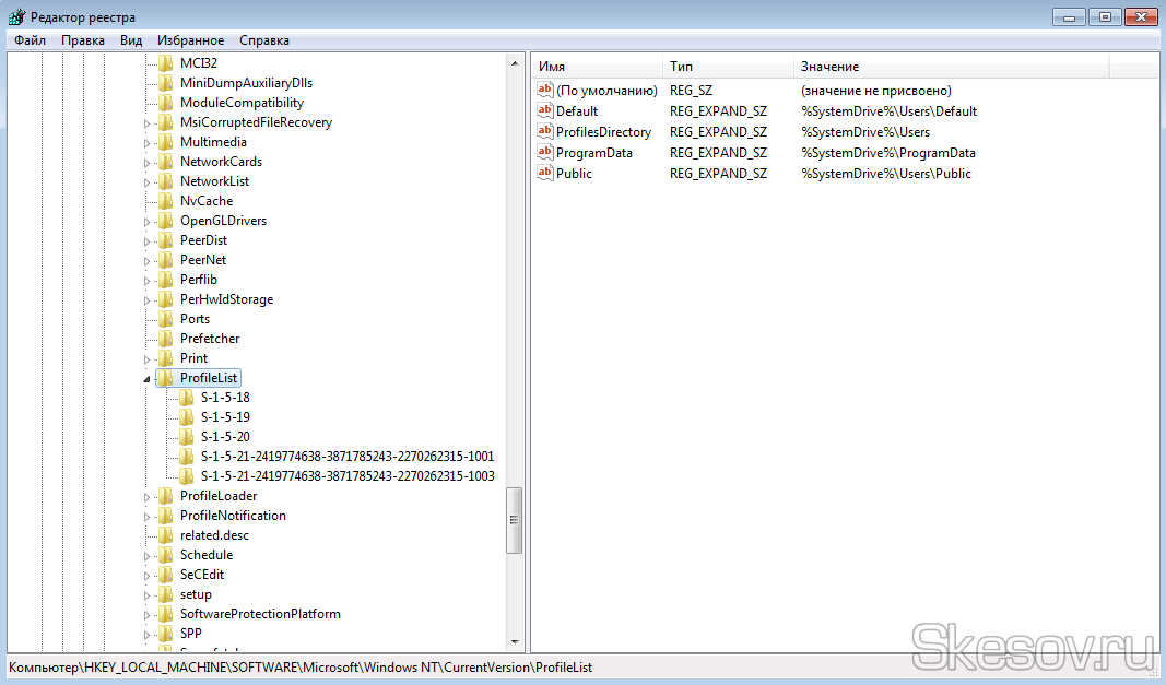 HKEY_LOCAL_MACHINE \ Программное обеспечение \ Microsoft \ Windows NT \ Текущая версия \ Список профилей