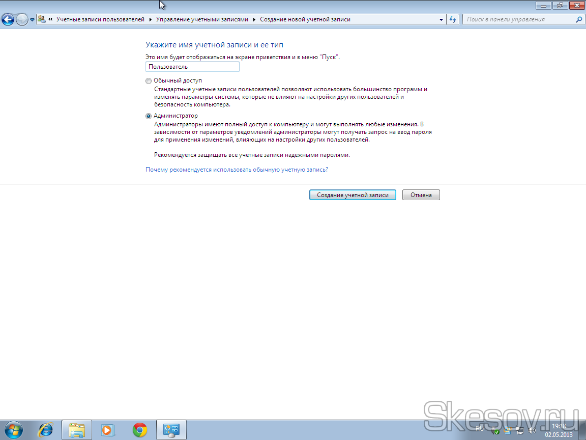 . Выбираем тип учетной записи, лучше, конечно, «Administrator».