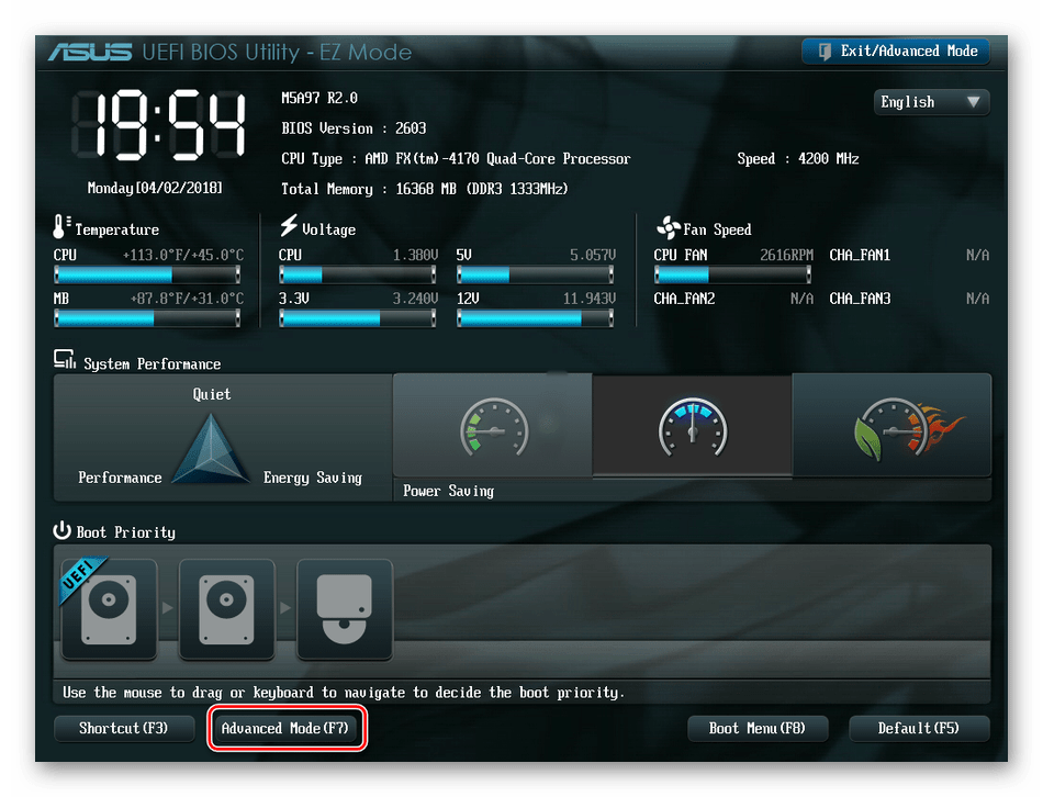 - Войдя в БИОС, вы должны перейти в расширенный режим. Для этого нажмите F7.