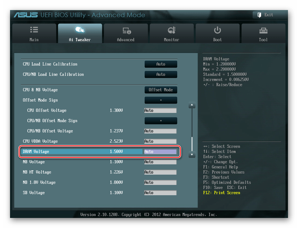 Опять возвращаемся на прошлую вкладку и далее наблюдаем параметр «DRAM Voltage», где можно изменять подаваемое на модули оперативной памяти напряжение электрического тока. Повышать вольтаж можно на минимальные значения и поэтапно.