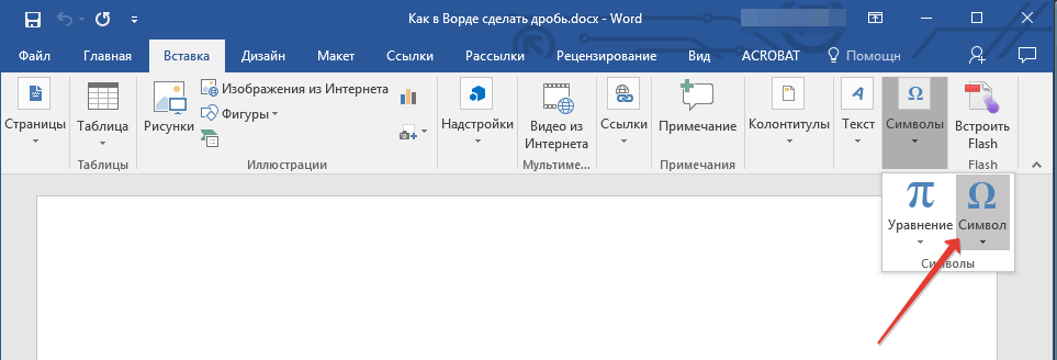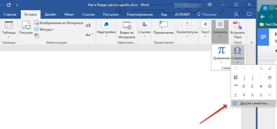 Правильно вставить дробь в Word нам поможет уже хорошо знакомое меню “Символы” , где находится множество знаков и специальных символов, которых вы не найдете на компьютерной клавиатуре. Итак, чтобы в Ворде написать дробное число со слешем, выполните следующие действия: