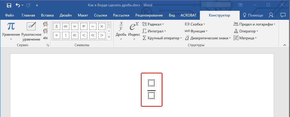 3. Во вкладке “Конструктор” , которая появится на панели управления, нажмите на кнопку “Дробь” .
