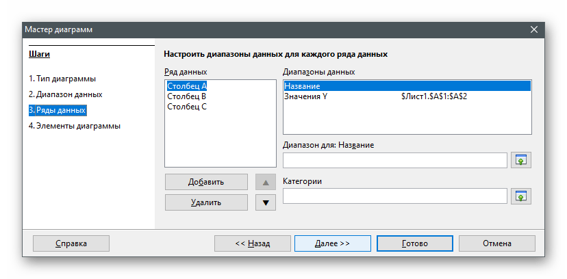 Позаботьтесь и о том, чтобы в диаграмму включились все присутствующие или только необходимые ряды данных, после чего завершите создание, кликнув на «Готово».