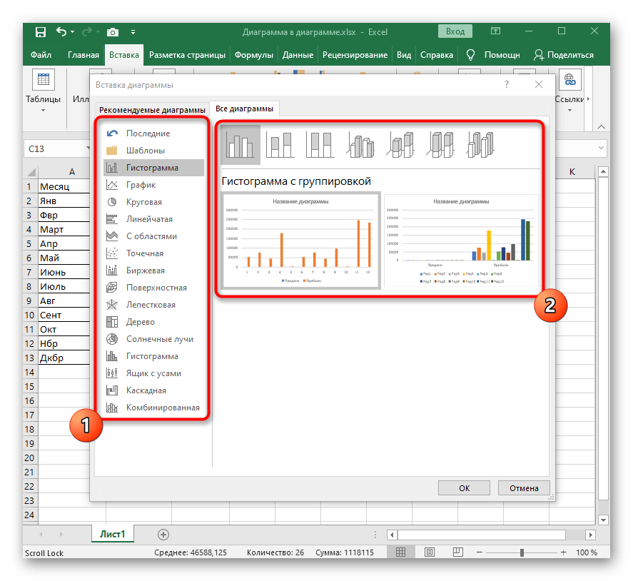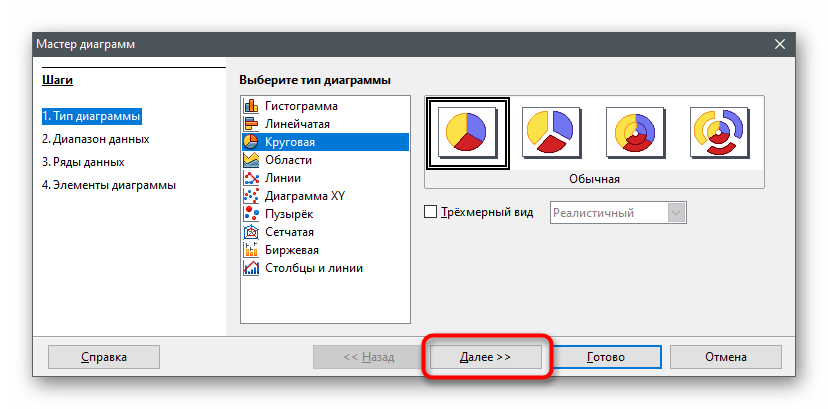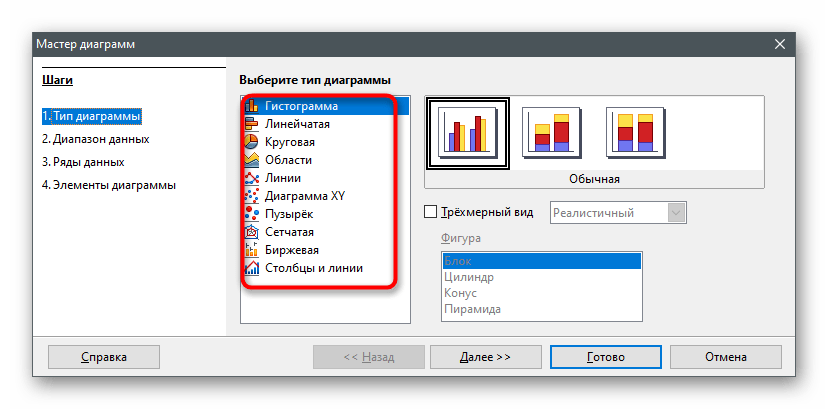 Если вы уже выбрали тип будущей диаграммы, необходимо выбрать соответствующее название левой кнопкой мыши, после чего программа предложит определиться с подтипами – диаграмма в новых версиях может быть стандартной, линейчатой, объемной.