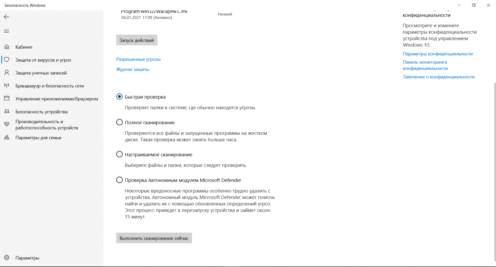 Затем нужно выбрать режим (быструю или полную проверку) и нажать на кнопку «Выполнить сканирование сейчас». В отдельных случаях рекомендуется использовать автономный модуль Microsoft Defender или ручной выбор папок для антивирусной проверки. Последнее востребовано для только что скачанных файлов и при подключении внешних носителей.