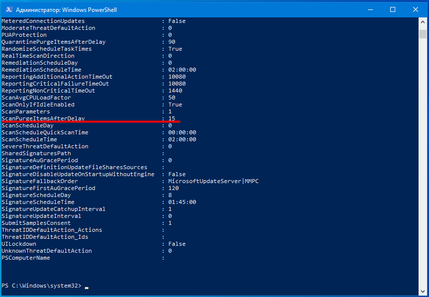 Для этого введите или скопируйте и вставьте командлет который, получает настройки для сканирования и обновлений Защитника Windows: