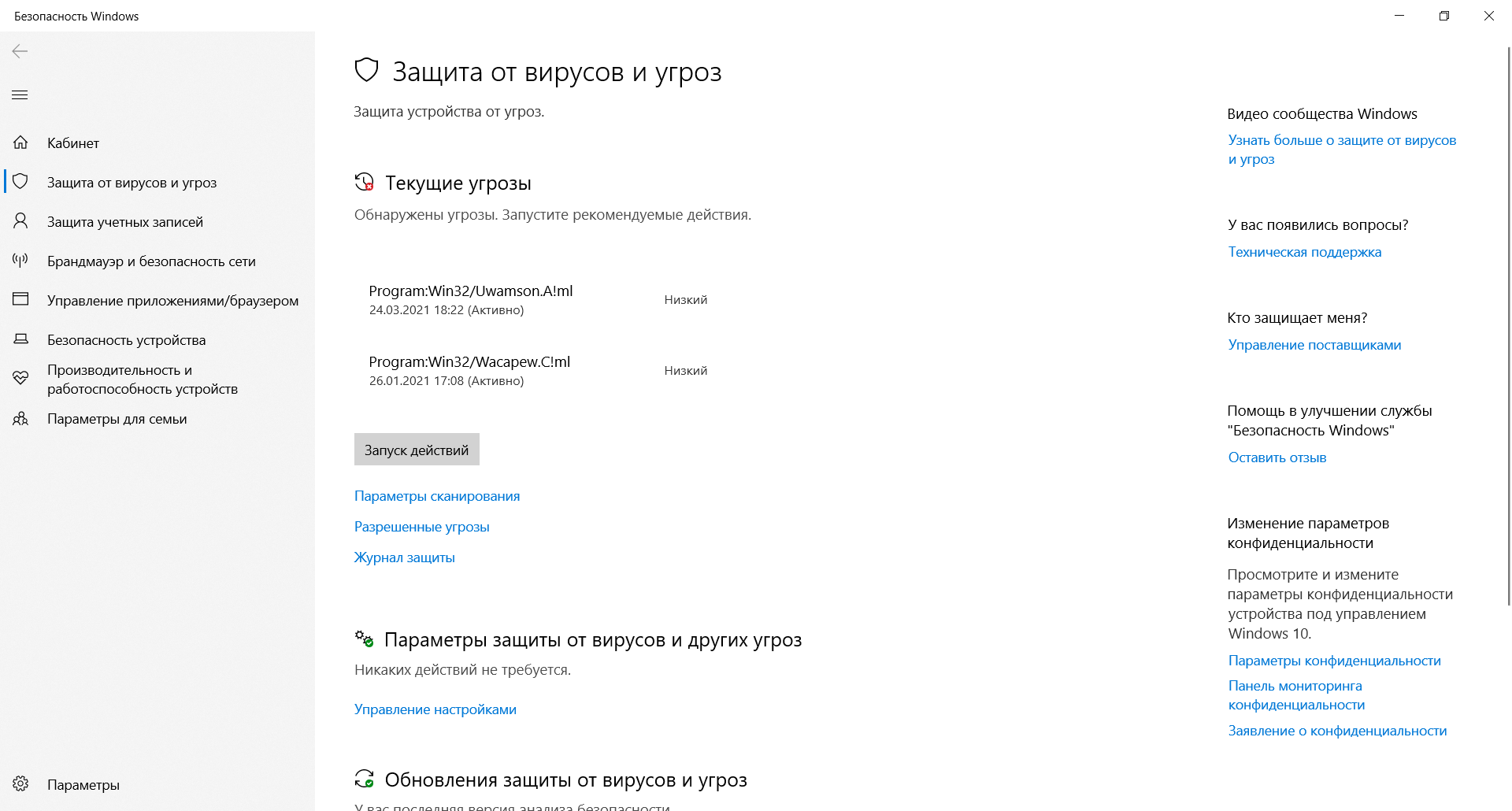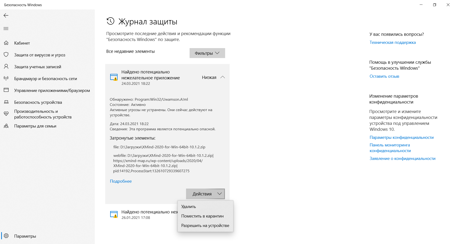 Если антивирусная программа Microsoft Defender обнаруживает часть вредоносных программ, она будет записана в журнал защиты.