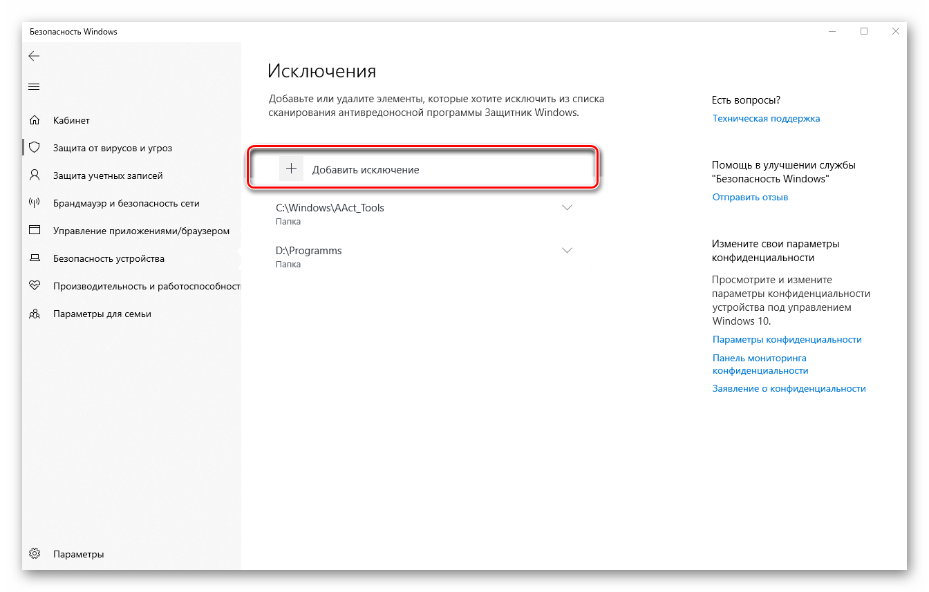 Настройка исключений в Защитнике Windows