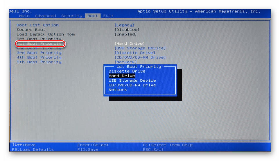 В новом BIOS — Boot > 1st Boot Priority.