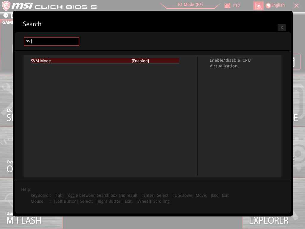 Для поиска нажмите на иконку с лупой в верхнем правом углу и наберите в строке поиска SVM: Утилита сразу должна найти нужную опцию. В других материнских платах эта опция может называться полностью Secure virtual machine или AMD-V. Можете попробовать разные комбинации этих слов.