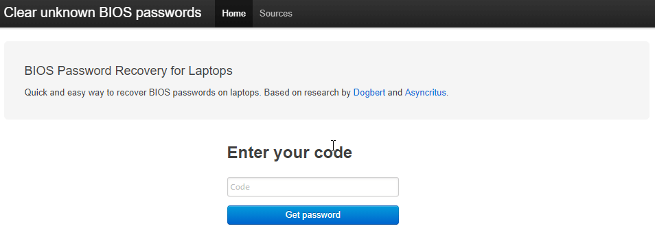 Этот код поможет нам в отключении пароля БИОС. Запишите его или запомните. Затем зайдите на сайт BIOS-PW.org и впишите его в поле «Enter your code». Нажмите кнопку «Get password».
