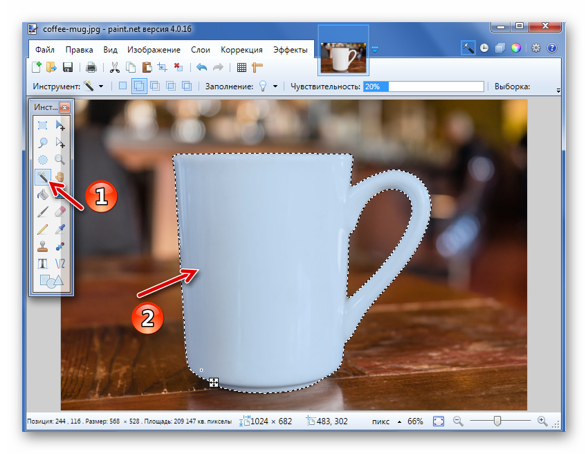 Как видно, теперь трафарет проходит ровно по краям кружки. Если же «Волшебная палочка» наоборот оставила кусочки фона вокруг основного объекта, то чувствительность можно попытаться повысить.