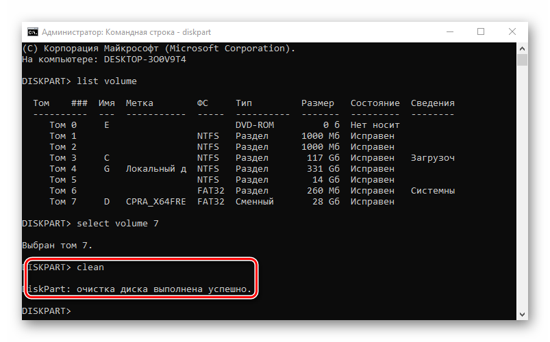В строке прописываем clean , чтобы полностью очистить накопитель.