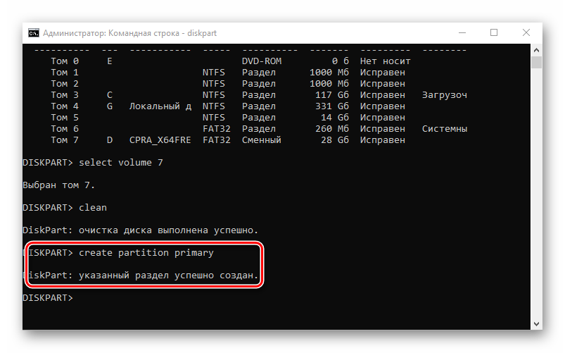 Создаем на флешке новый специальный раздел с помощью команды create partition primary .