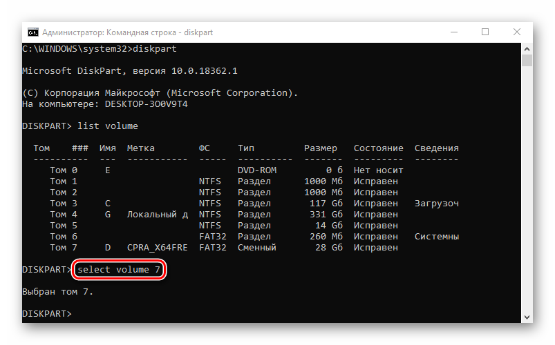 Задаем команду select volume 7 , чтобы выбрать том.