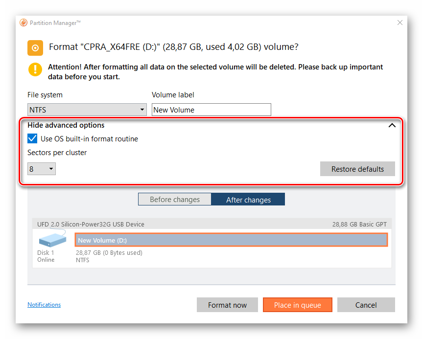 В области расширенных настроек можно изменить размер кластера, либо оставить значение, заданное по умолчанию.