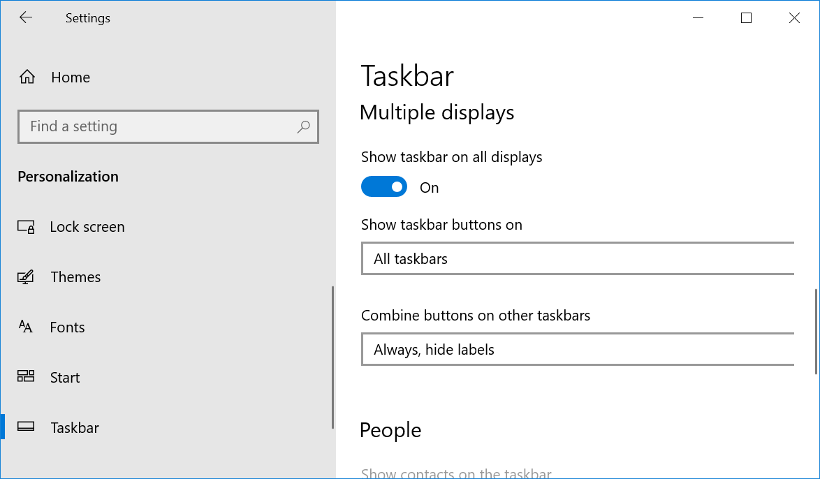 - Включите параметр «Показывать панель задач на всех дисплеях» в разделе «Несколько дисплеев».