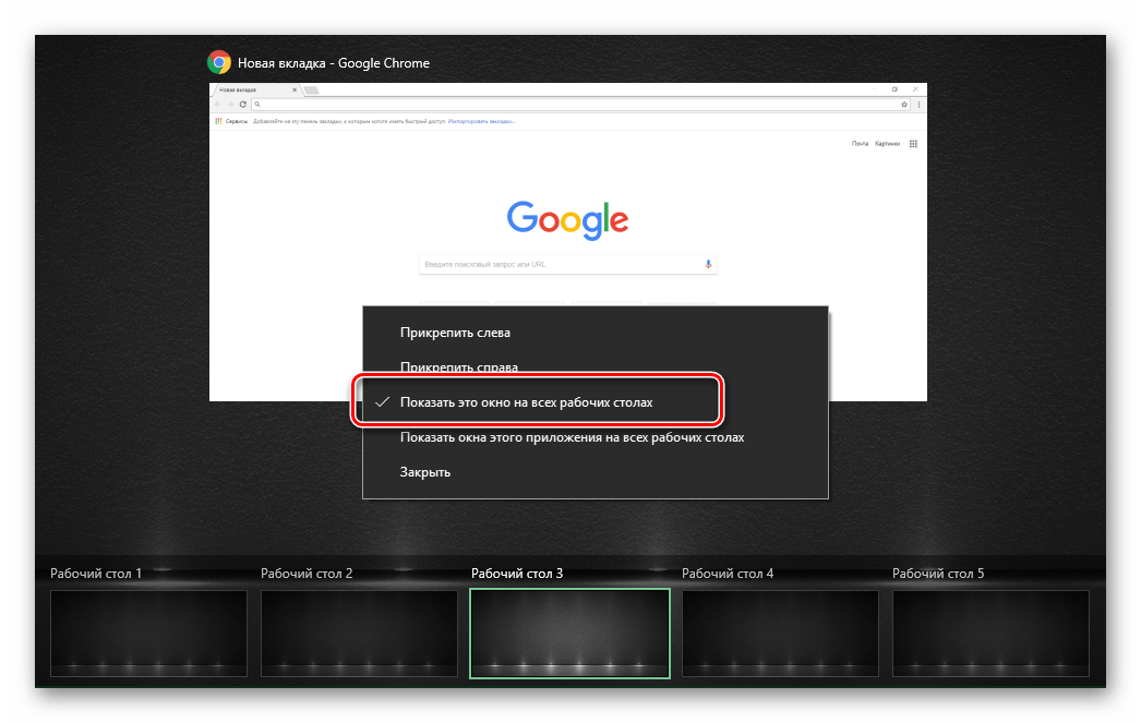 Еще одна полезная функция в контекстном меню – это «Показать это окно на всех». После ее включения выбранное окно будет отображаться на всех созданных рабочих столах