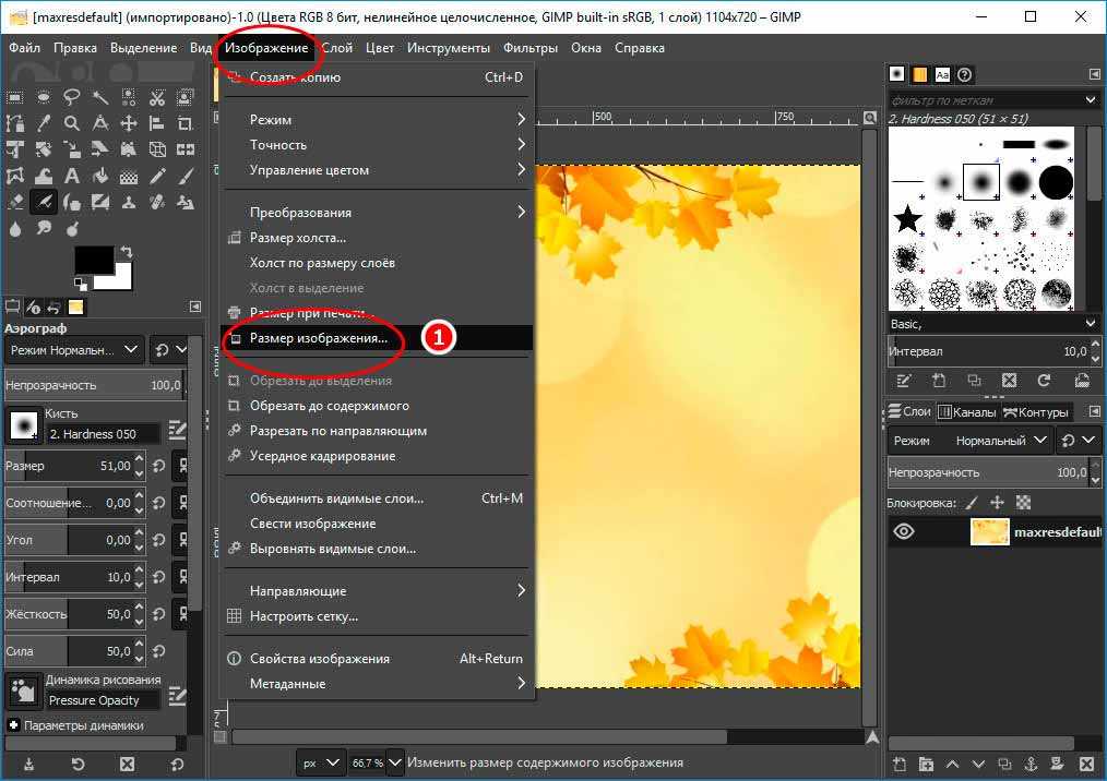 Установив все три программы (описанные выше). Запустите первым делом GIMP. Откройте в нём картинку. Проследуйте в меню «Изображение > «Размер изображения».