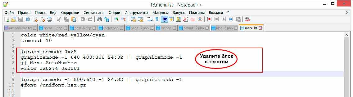 Вернитесь в корень флешки, откройте «Блокнотом» файл menu.lst. Удалите указанный на скриншоте блок текста.