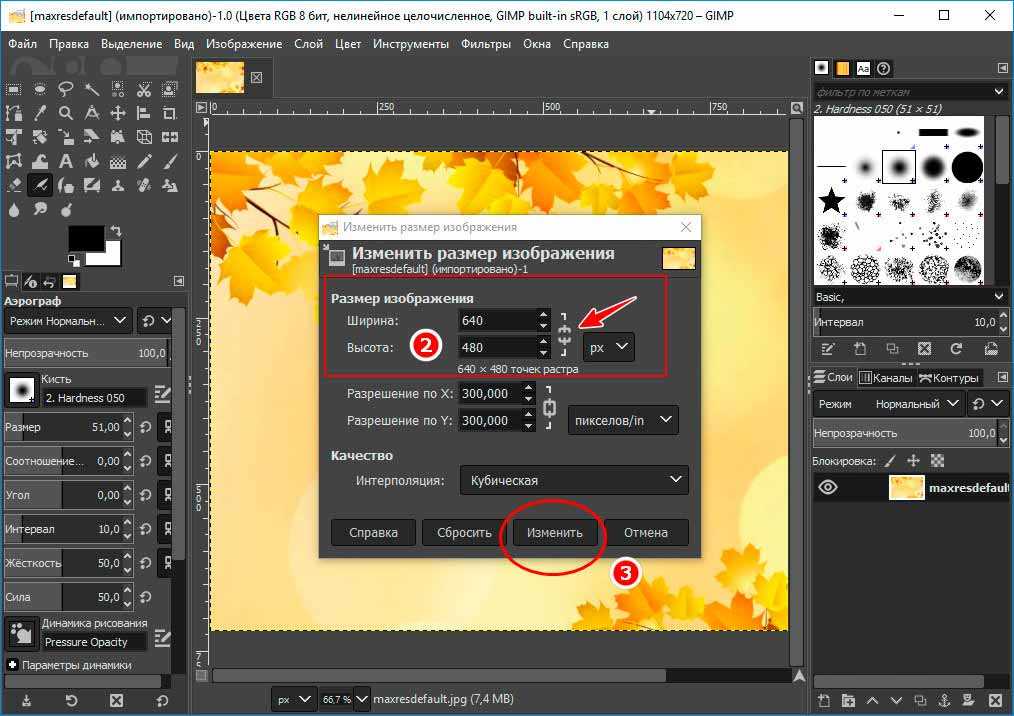 Отключите сохранение соотношения сторон и выставьте размер картинки 640×480 px. Нажмите «Изменить».