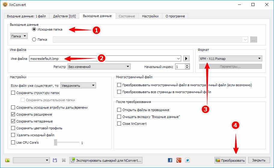 Переключитесь на вкладку «Выходные данные». И установите параметры так, как показано на скриншоте за исключением лишь названия картинки. Которое у Вас будет свое. Нажмите «Преобразовать».