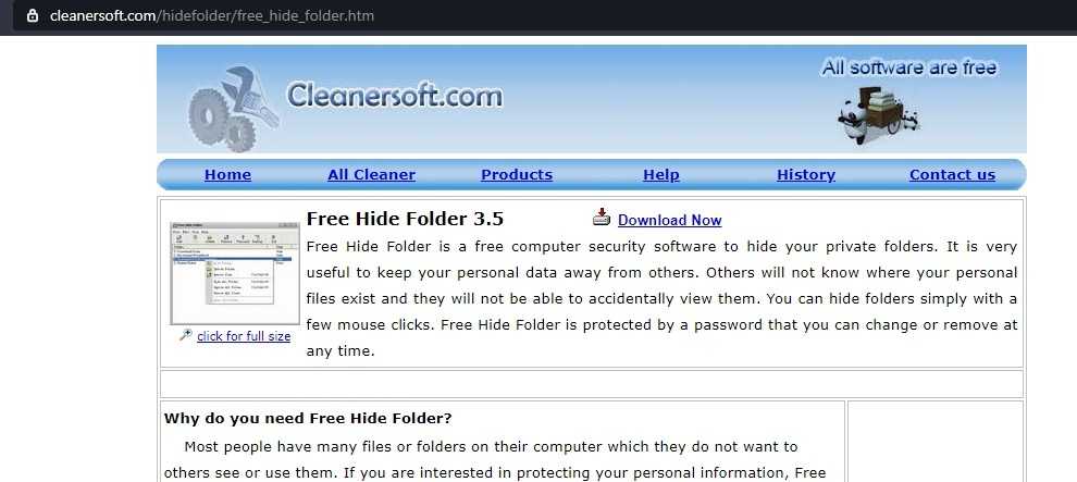 Использование программы Free Hide Folder – более удобный способ скрыть содержимое, отображаемое на экране готового к работе компьютера. Что следует запомнить при работе с ней – не забыть сохранить резервные данные. Ссылка для бесплатного скачивания –http://www.cleanersoft.com/hidefolder/free_hide_folder.htm.