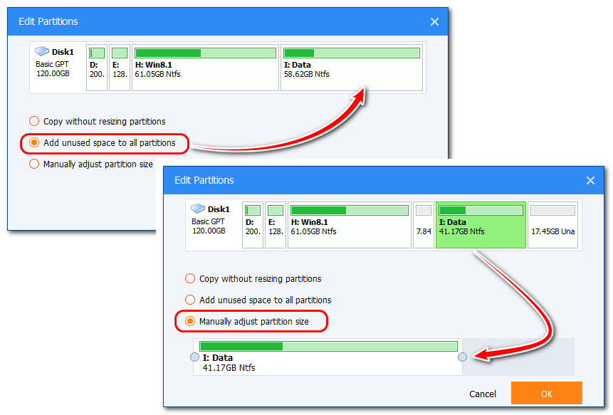 Это возможность редактирования разметки на диске назначения. Если он больше по объёму исходника, опция «Add unused space to all partitions» предлагает нам равномерно распределить остаток места по все разделам. Выбрав опцию «Manually adjust partition size», при необходимости можем скорректировать размер разделов диска назначения.