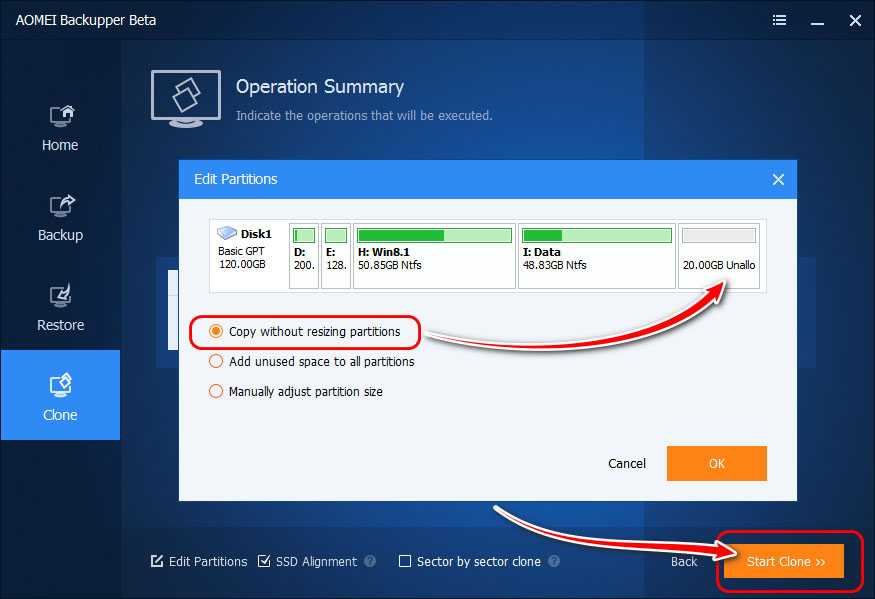 Опция «Copy without resizing partitions» – это клонирование без каких-либо изменений с оставлением пустого неразмеченного пространства в конце, если носитель назначения больше по объёму, чем исходник. Её мы выберем в нашем случае. Всё тщательно проверяем и запускаем операцию клонирования кнопкой «Start Clone».