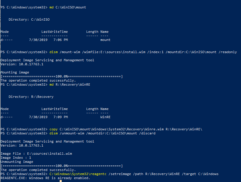 md C:WinISOmd C:WinISOmountdism /mount-wim /wimfile:F:sourcesinstall.wim /index:1 /mountdir:C:WinISOmount /readonlymd R:RecoveryWinREcopy C:WinISOmountWindowsSystem32RecoveryWinre.wim R:RecoveryWinREdism /unmount-wim /mountdir:C:WinISOmount /discard
