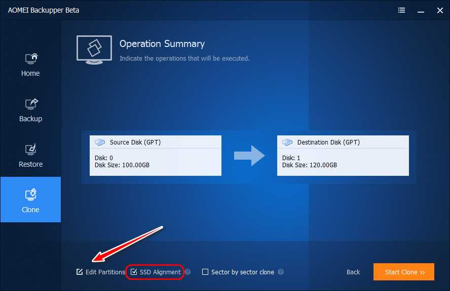 На этапе «Operation Summary» ставим чекбокс «SSD Alignment», это выравнивание разделов. И можем нажать «Edit Partitions».