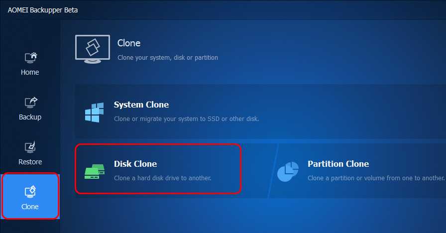 В окне AOMEI Backupper Beta отправляемся в раздел «Clone», выбираем операцию «Disk Clone».