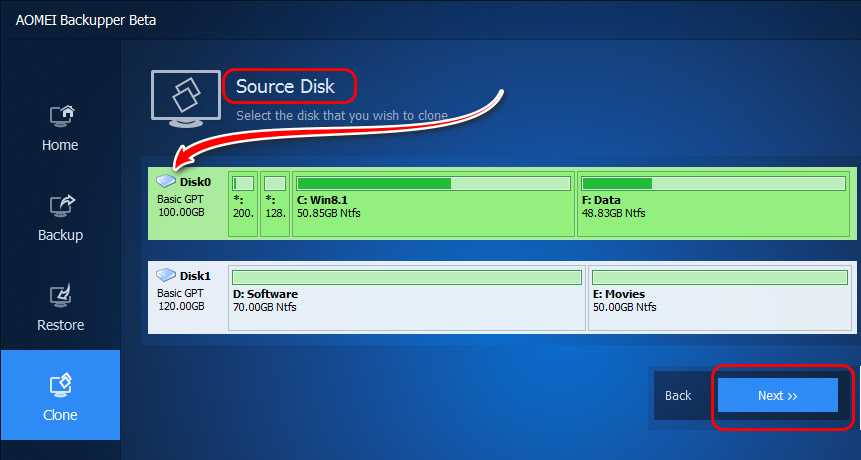 - В открывшемся окне нажмите «Next» (Далее), а на следующем экране выберите тот диск, с которого будет выполняться перенос Windows. Нажмите «Next».