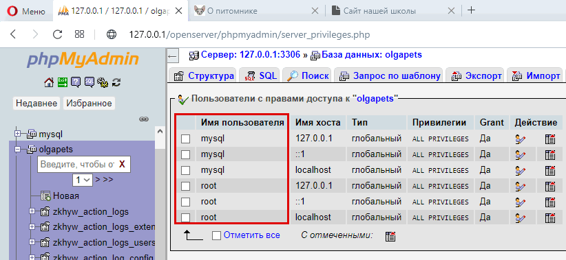 - Пароль: оставляем пустым (по умолчанию в openserver это пустое поле)