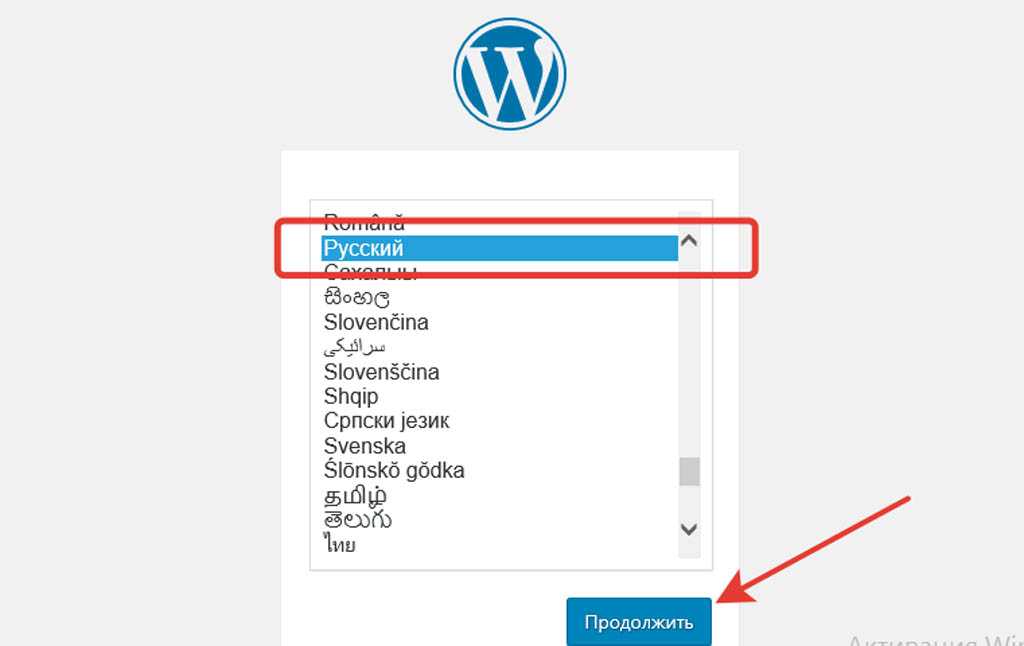 Вы должны увидеть загрузочный экран выбора языка установки WordPress.