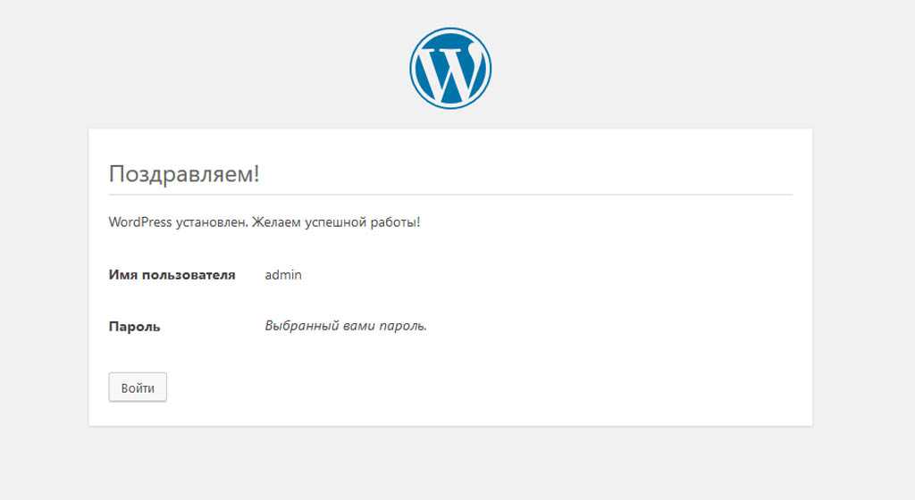 В браузере мы увидим поздравление и предложение войти в админ-панель, или Консоль WordPress с выбранным логином и паролем администратора.