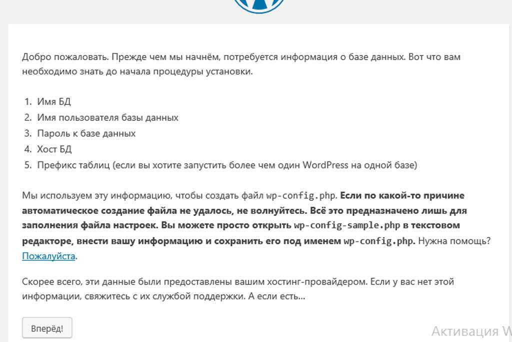 Следующее окно, которое вы увидете будет содержать справочную информацию, ознакомьтесь с ней и нажмите «Вперед!»