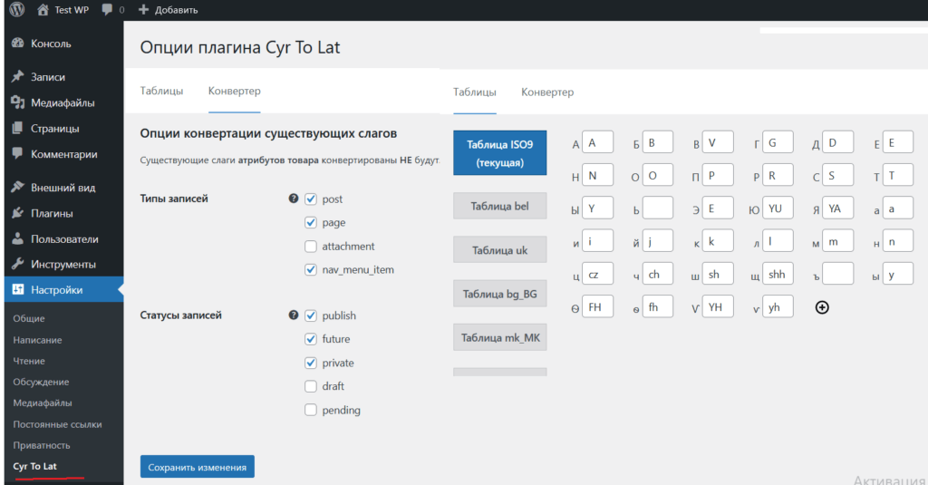 Настройки плагина Cyr-toLat предполагают, что вы можете изменить написание любого символа для различных языковых таблиц, а также указать, какие виды ссылок нужно транслитерировать. По умолчанию это записи (post), страницы (page) и элементы меню (nav_menu_item).