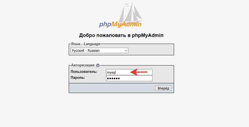 На панели управления openserver нажмите кнопку «phpMyAdmin в разделе Дополнительно. Новое окно браузера автоматически откроется с полями вода данных для входа в панели управления phpMyAdmin. Введите логин: mysql и пароль: mysql а затем кнопку «Вперед».